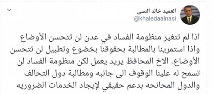 طالب الكاتب والمحلل العسكري، العميد خالد النسي، بالوقوف خلف محافظ العاصمة عدن ضد منظومة الفساد.