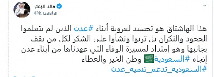 وقال في تغريدة عبر "تويتر" رصدها "المشهد العربي": "هذا الهاشتاق هو تجسيد لعروبة أبناء عدن الذين لم يتعلموا الجحود والنكران بل تربوا ونشأوا على الشكر لكل من يقف بجانبها وهو إمتداد لمسيرة الوفاء التي عهدناها من أبناء عدن اتجاه السعودية وطن الخير والعطاء السعودية تدعم تنمية عدن".