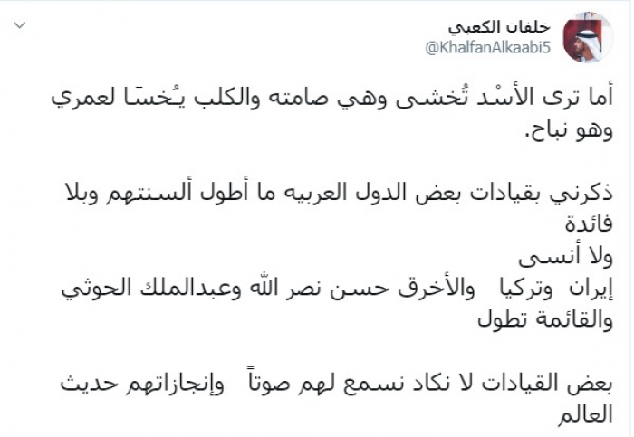 وكتب عبر تغريدة له على "تويتر" رصدها "المشهد العربي": "أما ترى الأسْد تُخشى وهي صامتة والكلب يـُخسَا لعمري وهو نباح، ذكرني بقيادات بعض الدول العربية ما أطول ألسنتهم وبلا فائدة، ولا أنسى إيران وتركيا والأخرق حسن نصر الله وعبدالملك الحوثي والقائمة تطول، بعض القيادات لا نكاد نسمع لهم صوتا وإنجازاتهم حديث العالم".