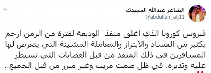 وكتب عبر تغريدة له على "تويتر" رصدها "المشهد العربي": "فيروس كورونا الذي أغلق منفذ الوديعة لفترة من الزمن أرحم بكثير من الفساد والابتزاز والمعاملة المشينة التي يتعرض لها المسافرون في ذلك المنفذ من قبل العصابات التي تسيطر عليه وتديره، في ظل صمت مريب وغير مبرر من قبل الجميع".