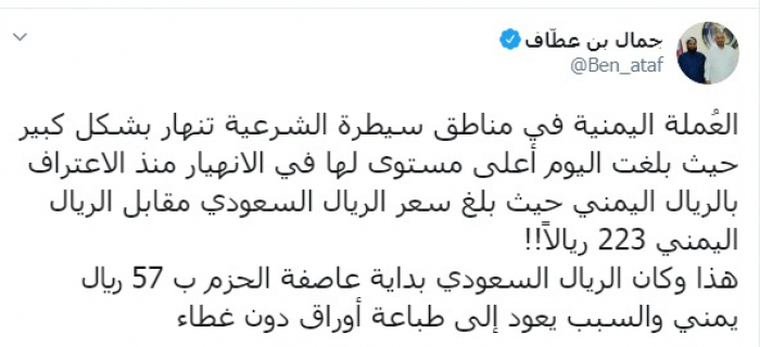 وكتب عبر تغريدة له على "تويتر" رصدها "المشهد العربي": "العُملة اليمنية في مناطق سيطرة الشرعية تنهار بشكل كبير حيث بلغت اليوم أعلى مستوى لها في الانهيار منذ الاعتراف بالريال اليمني حيث بلغ سعر الريال السعودي مقابل الريال اليمني 223 ريالا، هذا وكان الريال السعودي بداية عاصفة الحزم بـ 57 ريالا يمنيا والسبب يعود إلى طباعة أوراق دون غطاء".