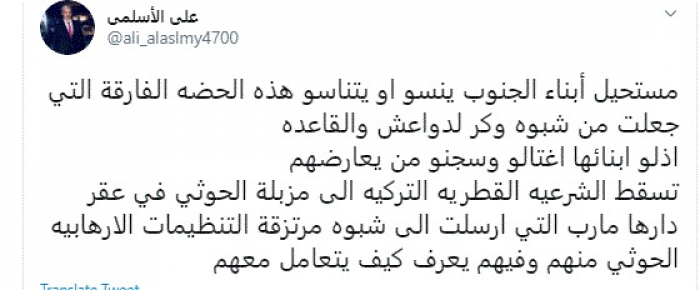 وكتب في تغريدة عبر "تويتر" رصدها "المشهد العربي": "مستحيل أبناء الجنوب ينسوا أو يتناسوا هذه اللحظة الفارقة التي جعلت من شبوة وكرًا لدواعش والقاعدة أذلوا أبنائها، اغتالوا وسجنوا من يعارضهم".