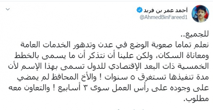 وكتب عبر تغريدة له على "تويتر" رصدها "المشهد العربي": "للجميع، نعلم تماما صعوبة الوضع في عدن وتدهور الخدمات العامة ومعاناة السكان، ولكن علينا أن نتذكر أن ما يسمى بالخطط الخمسية ذات البعد الاقتصادي للدول تسمى بهذا الاسم لأن مدة تنفيذها تستغرق ٥ سنوات، والأخ المحافظ لم يمض على وجوده على رأس العمل سوى ٣ أسابيع، والتعاون معه مطلوب".