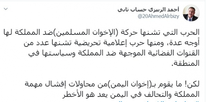 وكتب عبر تغريدة له على "تويتر" رصدها "المشهد العربي": "الحرب التي تشنها حركة (الإخوان المسلمين) ضد المملكة لها أوجه عدة، ومنها حرب إعلامية تحريضية يشنها عدد من القنوات الفضائية الموجهة ضد المملكة وسياستها في المنطقة، لكن ما يقوم به (إخوان اليمن)من محاولات إفشال مهمة المملكة والتحالف في اليمن يعد هو الأخطر".