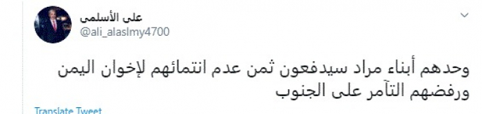 وكتب في تغريدة عبر "تويتر" رصدها "المشهد العربي": "وحدهم أبناء مراد سيدفعون ثمن عدم انتمائهم لإخوان اليمن ورفضهم التآمر على الجنوب".