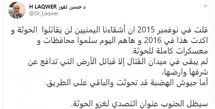وكتب في تغريدة عبر "تويتر" رصدها "المشهد العربي": "قلت في نوفمبر 2015 ان أشقاءنا اليمنيين لن يقاتلوا الحوثة وأكدت هذا في 2016 وها هم اليوم سلموا محافظات ومعسكرات كاملة للحوثة".