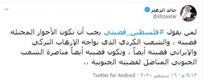 وكتب "الزعتر" تغريدة عبر تويتر، رصدها "المشهد العربي": "لمن يقول فلسطين قضيتي، يجب أن تكون الأحواز المحتله قضيته ، والشعب الكردي الذي يواجه الإرهاب التركي والإيراني قضيته أيضا، وتكون قضيته أيضا مناصرة الشعب الجنوبي المناضل لقضيته الجنوبية".