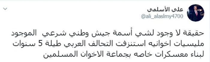 وكتب عبر تغريدة له على "تويتر" رصدها " المشهد العربي": "حقيقة لا وجود لشيء اسمه جيش وطني شرعي، الموجود مليشيات إخوانية استنزفت التحالف العربي طيلة 5 سنوات لبناء معسكرات خاصة بجماعة الإخوان المسلمين".