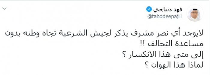 وكتب عبر تغريدة له على "تويتر" رصدها "المشهد العربي": "لا يوجد أي نصر مشرف يذكر لجيش الشرعية تجاه وطنه بدون مساعدة التحالف، إلى متى هذا الانكسار؟ لماذا هذا الهوان؟"