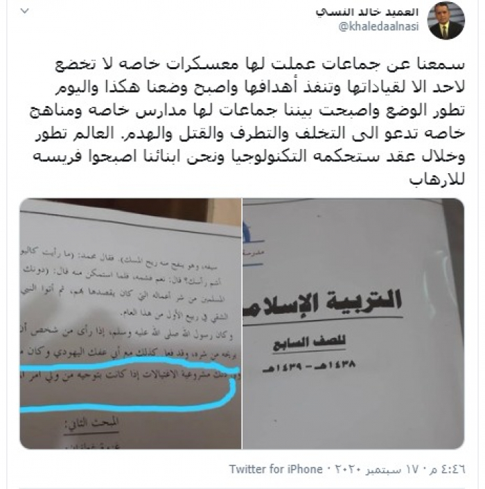 حذر الكاتب والمحلل العسكري، العميد خالد النسي، من تسميم عقول الطلاب عبر المناهج المتطرفة والتي تحث على الإرهاب والعنف.