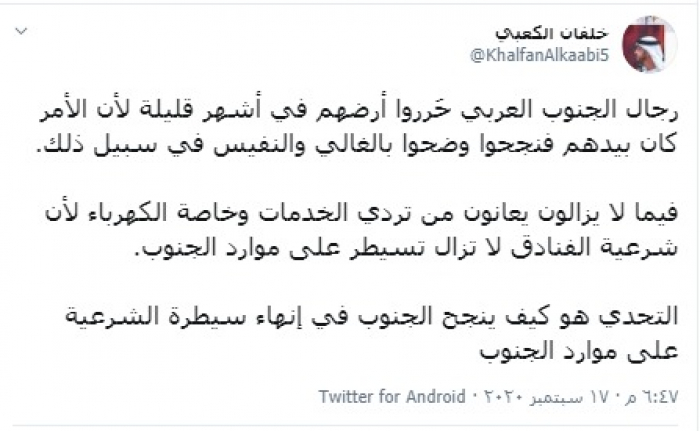 وكتب "الكعبي": "رجال الجنوب العربي حرروا أرضهم في أشهر قليلة لأن الأمر كان بيدهم فنجحوا وضحوا بالغالي والنفيس في سبيل ذلك".