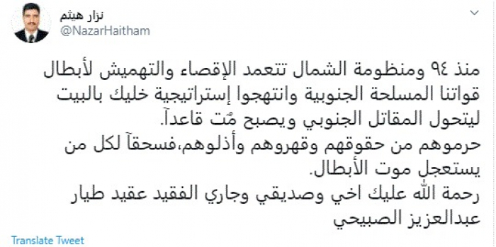 وكتب في تغريدة عبر "تويتر" رصدها "المشهد العربي": "منذ 94 ومنظومة الشمال تتعمد الإقصاء والتهميش لأبطال قواتنا المسلحة الجنوبية وانتهجوا استراتيجية خليك بالبيت ليتحول المقاتل الجنوبي ويصبح مٌت قاعدًا".