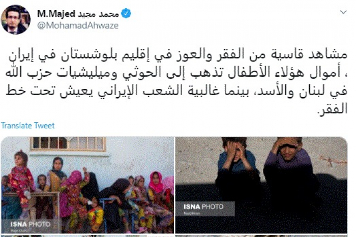 وكتب في تغريدة عبر "تويتر" رصدها "المشهد العربي": "مشاهد قاسية من الفقر والعوز في إقليم بلوشستان في إيران، أموال هؤلاء الأطفال تذهب إلى الحوثي ومليشيات حزب الله في لبنان والأسد، بينما غالبية الشعب الإيراني يعيش تحت خط الفقر".