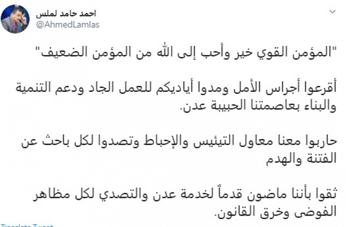 وقال في تغريدة عبر "تويتر" رصدها "المشهد العربي": "المؤمن القوي خير وأحب إلى الله من المؤمن الضعيف.. أقرعوا أجراس الأمل ومدوا أياديكم للعمل الجاد ودعم التنمية والبناء بعاصمتنا الحبيبة عدن".
