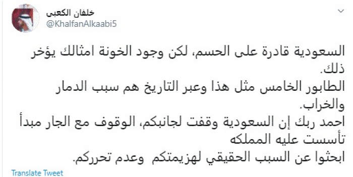 وقال في تغريدة عبر "تويتر" رصدها "المشهد العربي": "السعودية قادرة على الحسم، لكن وجود الخونة أمثالك يؤخر ذلك".