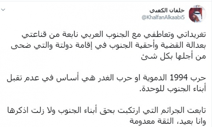 وكتب عبر تغريدة له على "تويتر" رصدها "المشهد العربي": "تغريداتي وتعاطفي مع الجنوب العربي نابعة من قناعتي بعدالة القضية وأحقية الجنوب في إقامة دولته والتي ضحى من أجلها بكل شيء، حرب 1994 الدموية أو حرب الغدر هي أساس في عدم تقبل أبناء الجنوب للوحدة".