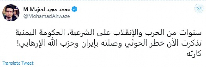 وقال في تغريدة عبر "تويتر" رصدها "المشهد العربي": "سنوات من الحرب والانقلاب على الشرعية، الحكومة اليمنية تذكرت الآن خطر الحوثي وصلته بإيران وحزب الله الإرهابي! كارثة".
