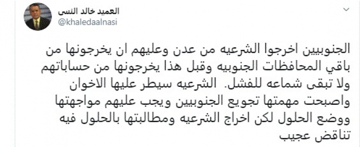 وقال في تغريدة عبر "تويتر" رصدها "المشهد العربي": "الجنوبيين أخرجوا الشرعية من عدن وعليهم أن يخرجونها من باقي محافظات الجنوب وقبل هذا يخرجونها من حساباتهم ولا تبقى شماعة للفشل".