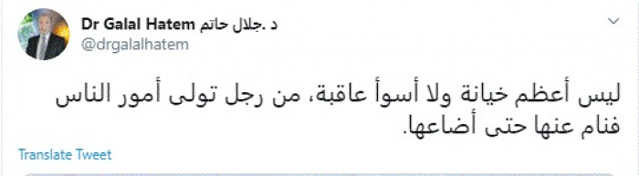 وقال في تغريدة عبر "تويتر" رصدها "المشهد العربي": " ليس أعظم خيانة ولا أسوأ عاقبة، من رجل تولى أمور الناس فنام عنها حتى أضاعها".