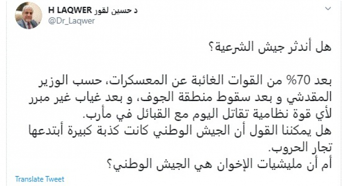 وقال في تغريدة عبر "تويتر" رصدها "المشهد العربي": "هل اندثر جيش الشرعية؟ بعد 70% من القوات الغائبة عن المعسكرات، حسب الوزير المقدشي وبعد سقوط منطقة الجوف، وبعد غياب غير مبرر لأي قوة نظامية تقاتل اليوم مع القبائل في مأرب".