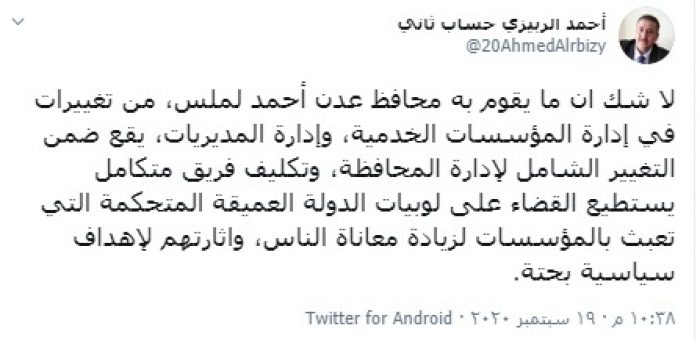 وكتب "الربيزي" في تغريدة عبر تويتر، رصدها "المشهد العربي": "لا شك أن ما يقوم به محافظ عدن، أحمد لملس، من تغييرات في إدارة المؤسسات الخدمية، وإدارة المديريات، يقع ضمن التغيير الشامل لإدارة المحافظة، وتكليف فريق متكامل يستطيع القضاء على لوبيات الدولة العميقة المتحكمة التي تعبث بالمؤسسات لزيادة معاناة الناس، وإثارتهم لأهداف سياسية بحتة".
