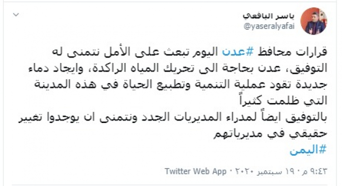وكتب "اليافعي": "قرارات محافظ عدن اليوم تبعث على الأمل نتمنى له التوفيق".