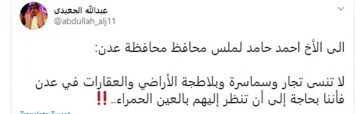 وقال في تغريدة عبر "تويتر" رصدها "المشهد العربي": "إلى الأخ أحمد حامد لملس محافظ محافظة عدن: لا تنسى تجار وسماسرة وبلاطجة الأراضي والعقارات في عدن فأننا بحاجة إلى أن تنظر إليهم بالعين الحمراء".