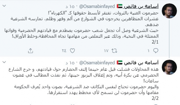 وكتب عبر تغريدة له على "تويتر" رصدها " المشهد العربي": "حضرموت الغنية بالثروات، تفتقر لأبسط حقوقها كـ"الكهرباء"، عشرات المتظاهرين يخرجون في الشوارع من ألم وقهر وظلم، تمارسه الشرعية ضدهم، خبث الشرعية وصل إلى أن تجعل شعب حضرموت يصطدم مع قيادتهم الحضرمية وقواتها الممثلة في النخبة، وذلك عبر التملص من مهامها تجاه المحافظة، وخلط الأوراق".