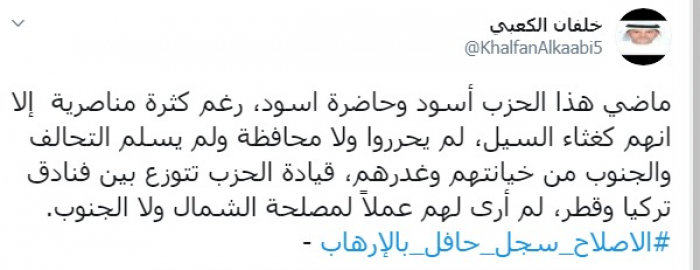 وكتب عبر تغريدة له على "تويتر" رصدها " المشهد العربي": "ماضي هذا الحزب أسود وحاضره أسود، رغم كثرة مناصريه إلا أنهم كغثاء السيل، لم يحرروا ولا محافظة ولم يسلم التحالف والجنوب من خيانتهم وغدرهم، قيادة الحزب تتوزع بين فنادق تركيا وقطر، لم أر لهم عملا لمصلحة الشمال ولا الجنوب".