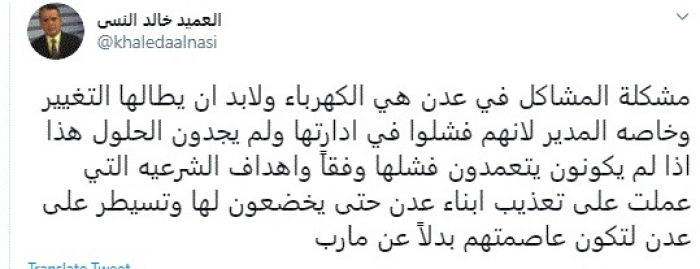 وقال في تغريدة عبر "تويتر" رصدها "المشهد العربي": "مشكلة المشاكل في عدن هي الكهرباء ولا بد أن يطالها التغيير وخاصة المدير لأنهم فشلوا في إدارتها ولم يجدون الحلول".