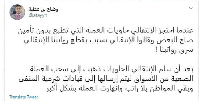 وأضاف: "بعد أن سلم الانتقالي الحاويات ذهبت إلى سحب العملة الصعبة من الأسواق ليتم إرسالها إلى قيادات شرعية المنفى وبقي المواطن بلا راتب وانهارت العملة بشكل أكبر".