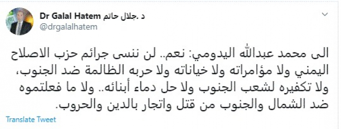 وقال في تغريدة عبر "تويتر" رصدها "المشهد العربي": "إلى محمد عبدالله اليدومي: نعم.. لن ننسى جرائم حزب الإصلاح اليمني ولا مؤامراته ولا خياناته ولا حربه الظالمة ضد الجنوب، ولا تكفيره لشعب الجنوب ولا حل دماء أبنائه".