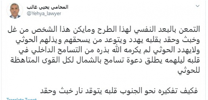 وقال في تغريدة عبر "تويتر" رصدها "المشهد العربي": "التمعن بالبعد النفسي لهذا الطرح وما يكن هذا الشخص من غل وخبث وحقد بقلبه يهدد ويتوعد من يسحقهم ويذلهم الحوثي ولا يهدد الحوثي".