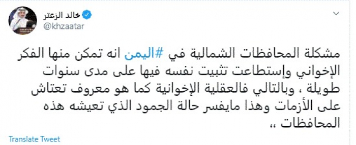 وكتب في تغريدة عبر "تويتر" رصدها "المشهد العربي": "مشكلة المحافظات الشمالية في اليمن أنه تمكن منها الفكر الإخواني واستطاع تثبيت نفسه فيها على مدى سنوات طويلة".