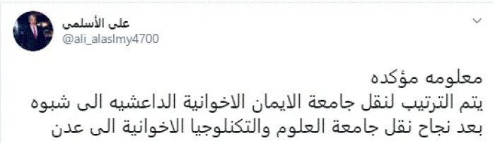 وقال في تغريدة عبر "تويتر" رصدها "المشهد العربي": "معلومة مؤكدة يتم الترتيب لنقل جامعة الإيمان الإخوانية الداعشية إلى شبوة بعد نجاح نقل جامعة العلوم والتكنلوجيا الإخوانية إلى عدن".