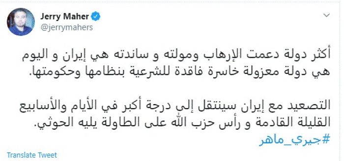 توقع الكاتب الصحفي اللبناني جيري ماهر، اليوم، زيادة حدة التصعيد الدولي ضد إيران وحزب الله ومليشيات الحوثي.
