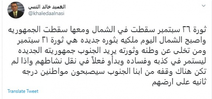 قال الكاتب والمحلل العسكري العميد خالد النسي، اليوم، إن الشمال أصبح يُريد الجنوب جمهوريته الجديدة ليستمر الكذب والفساد، مُطالبًا أبناء الجنوب بالوقوف ضد مخططات الشمال.