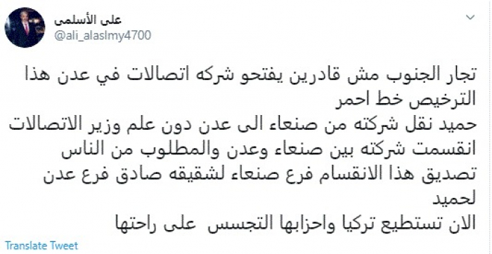وأضاف: "حميد نقل شركته من صنعاء إلى عدن دون علم وزير الاتصالات انقسمت شركته بين صنعاء وعدن والمطلوب من الناس تصديق هذا الانقسام فرع صنعاء لشقيقه صادق، فرع عدن لحميد".