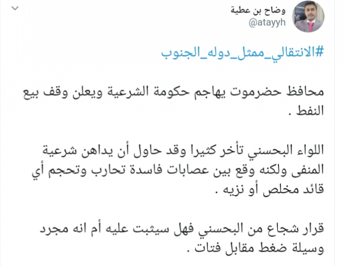 وكتب عبر تغريدة له على "تويتر" رصدها " المشهد العربي": "محافظ حضرموت يهاجم حكومة الشرعية ويعلن وقف بيع النفط، اللواء البحسني تأخر كثيرا وقد حاول أن يداهن شرعية المنفى ولكنه وقع بين عصابات فاسدة تحارب وتحجم أي قائد مخلص أو نزيه، قرار شجاع من البحسني فهل سيثبت عليه أم انه مجرد وسيلة ضغط مقابل فتات".