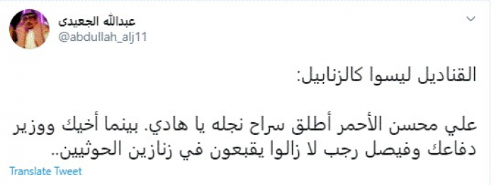 وقال في تغريدة عبر "تويتر" رصدها "المشهد العربي": "القناديل ليسوا كالزنابيل: علي محسن الأحمر أطلق سراح نجليه يا هادي. بينما أخيك ووزير دفاعك وفيصل رجب لا زالوا يقبعون في زنازين الحوثيين".
