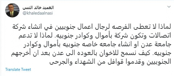 وقال في تغريدة عبر "تويتر" رصدها "المشهد العربي": "لماذا لا تعطى الفرصة لرجال أعمال جنوبيين في إنشاء شركة اتصالات وتكون شركة بأموال وكوادر جنوبية".
