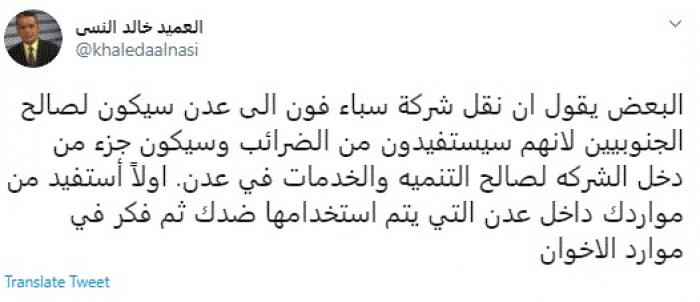 وقال في تغريدة عبر "تويتر" رصدها "المشهد العربي": "البعض يقول إن نقل شركة سبأ فون إلى عدن سيكون لصالح الجنوبيين لأنهم سيستفيدون من الضرائب وسيكون جزءا من دخل الشركه لصالح التنمية والخدمات في عدن".