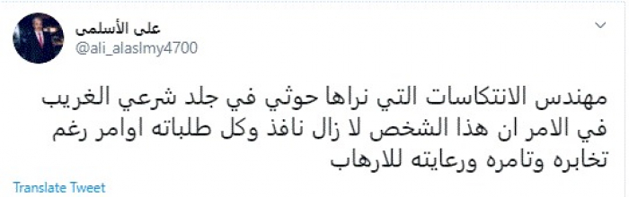 وقال في تغريدة عبر "تويتر" رصدها "المشهد العربي": "مهندس الانتكاسات التي نراها حوثي في جلد شرعي الغريب في الأمر أن هذا الشخص لا زال نافذا وكل طلباته أوامر رغم تخابره وتآمره ورعايته الإرهاب".