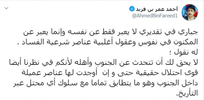 وأضاف: "له نقول، لا يحق لك أن تتحدث عن الجنوب وأهله لأنكم في نظرنا أيضًا قوى احتلال حقيقية حتى و إن أوجدت لها عناصر عميلة داخل الجنوب وهو ما يتطابق تمامًا مع سلوك أي محتل عبر التاريخ".