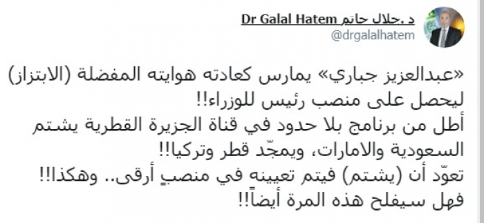 وكتب عبر تغريدة له على "تويتر" رصدها " المشهد العربي":" عبدالعزيز جباري يمارس كعادته هوايته المفضلة (الابتزاز) ليحصل على منصب رئيس الوزراء، أطل من برنامج بلا حدود في قناة الجزيرة القطرية يشتم السعودية والإمارات، ويمجّد قطر وتركيا، تعوّد أن (يشتم) فيتم تعيينه في منصبٍ أرقى، وهكذا، فهل سيفلح هذه المرة أيضًا".