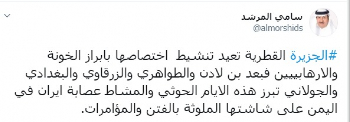 وكتب عبر تغريدة له على "تويتر" رصدها " المشهد العربي": "الجزيرة القطرية تعيد تنشيط اختصاصها بإبراز الخونة والإرهابيين فبعد بن لادن والظواهري والزرقاوي والبغدادي والجولاني تبرز هذه الأيام الحوثي والمشاط عصابة إيران في اليمن على شاشتها الملوثة بالفتن والمؤامرات".