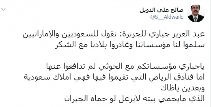 وكتب عبر تغريدة له على "تويتر" رصدها " المشهد العربي": "عبد العزيز جباري للجزيرة، نقول للسعوديين والإماراتيين سلموا لنا مؤسساتنا وغادروا بلادنا مع الشكر، يا جباري مؤسساتكم مع الحوثي لم تدافعوا عنها، أما فنادق الرياض التي تقيموا فيها فهي أملاك سعودية، وبعدين ياظاك، الذي ما يحمي بيته لا يزعل لو حماه الجيران".