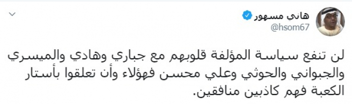 وكتب عبر تغريدة له على "تويتر" رصدها " المشهد العربي": "لن تنفع سياسة المؤلفة قلوبهم مع جباري وهادي والميسري والجبواني والحوثي وعلي محسن فهؤلاء وأن تعلقوا بأستار الكعبة فهم كاذبين منافقين".