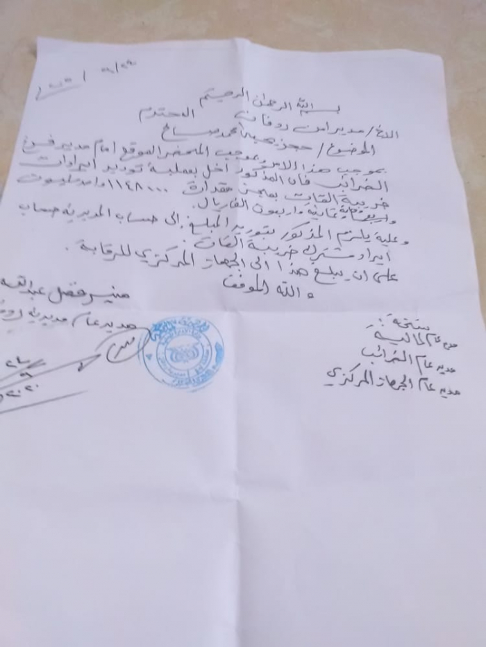 أحال مأمور مديرية ردفان، منير فضل عبدالله، محصل ضريبة قات إلى التحقيق، لشبهة إخلال بالتوريد المالي.