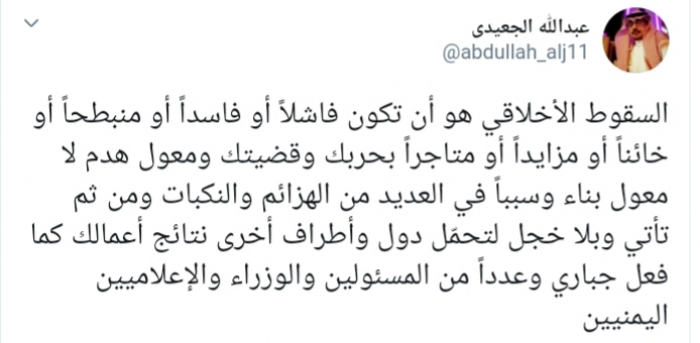 وكتب عبر تغريدة له على "تويتر" رصدها " المشهد العربي": "السقوط الأخلاقي هو أن تكون فاشلًا أو فاسدًا أو منبطحًا أو خائنًا أو مزايدًا أو متاجرًا بحربك وقضيتك ومعول هدم لا معول بناء وسببًا في العديد من الهزائم والنكبات ومن ثم تأتي وبلا خجل لتحمّل دولا وأطرافا أخرى نتائج أعمالك كما فعل جباري وعدد من المسئولين والوزراء والإعلاميين اليمنيين".
